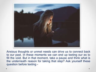 Texting an ex can be driven by anxious thoughts or unmet emotional needs. Before reaching out, it's crucial to reflect on the underlying reasons, potential consequences, and the reasons for the breakup. Instead of reconnecting with an ex, consider alternative ways to fulfill those needs, such as reaching out to friends, engaging in hobbies, or practicing self-reflection.