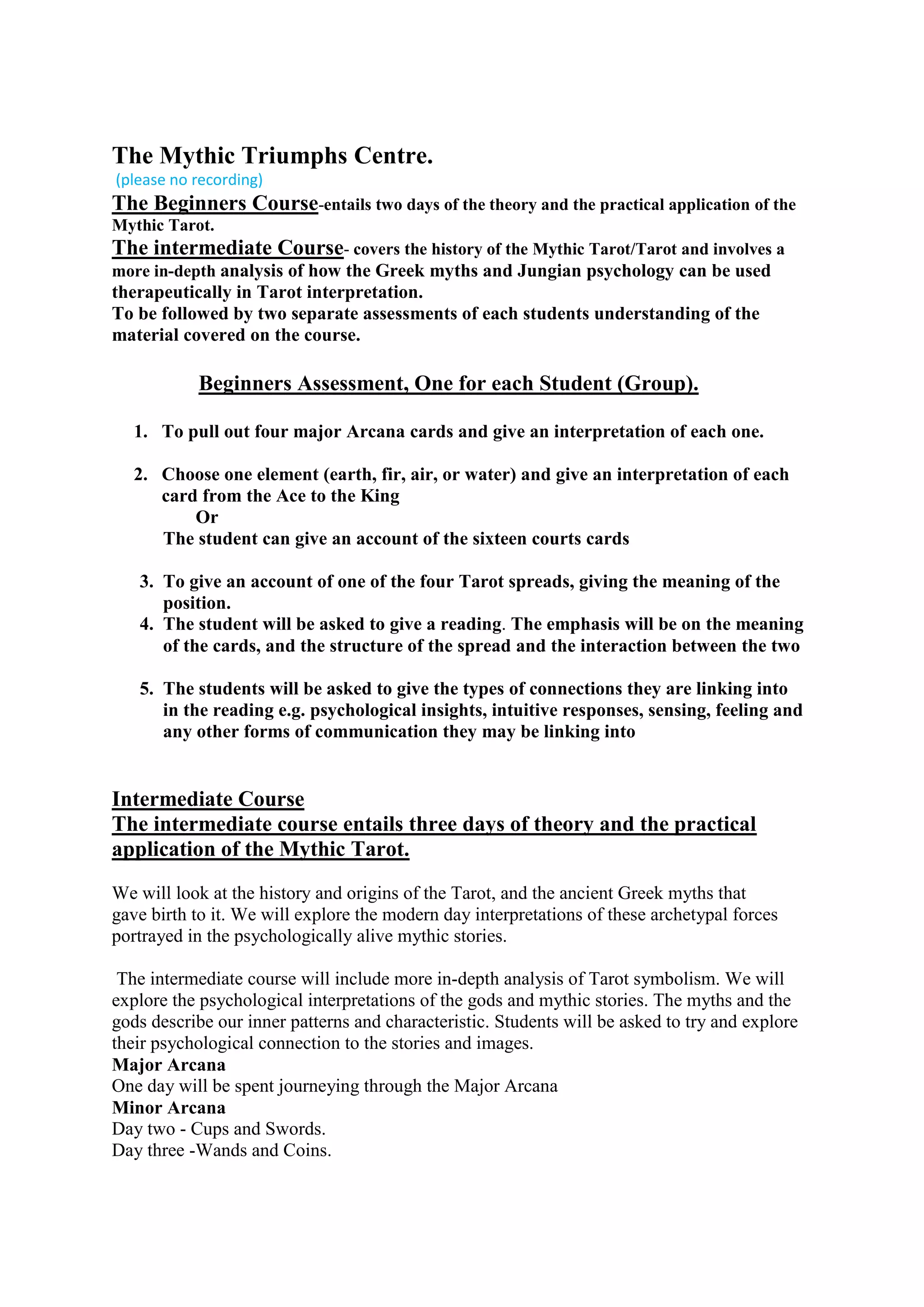 The document outlines the structure and curriculum of beginner and intermediate courses on the mythic tarot, including theory, practical applications, and therapeutic uses based on Greek myths and Jungian psychology. Assessments for both levels focus on interpretations of tarot cards, spreads, and the development of intuitive counseling skills. Additionally, the document describes one-day workshops exploring relationships through tarot readings, psychological astrology, and advanced reading techniques.