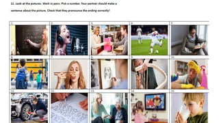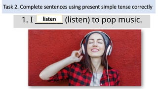 This document focuses on teaching the present simple tense through various exercises and examples. It includes tasks for completing sentences, new vocabulary related to daily activities, and listening practice. The material is structured for beginner learners to help them form correct sentences using the present simple tense.