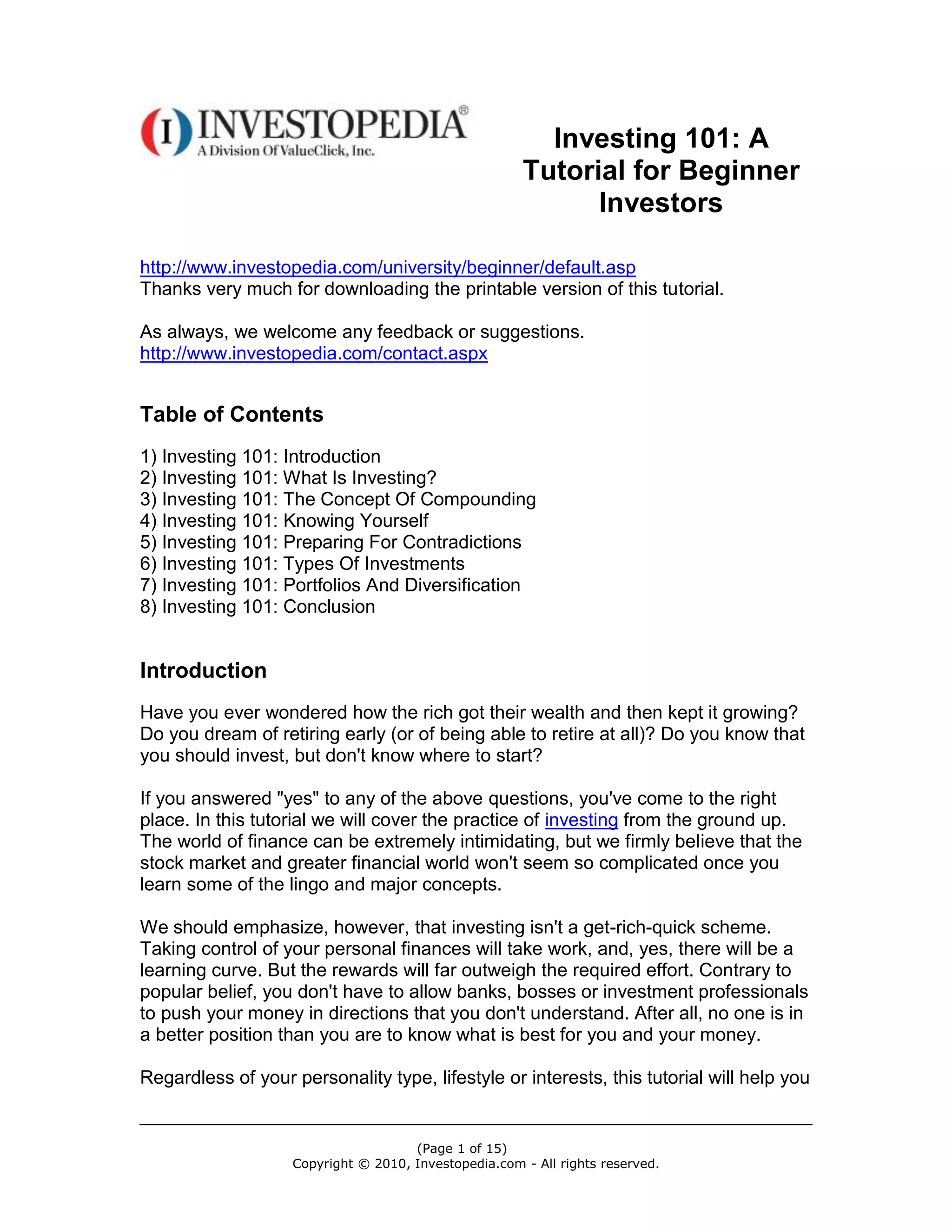 This document is the introduction to a 15-page tutorial on investing for beginners. It discusses what investing is, including putting money to work to generate additional income or profit through various investment vehicles. It also explains why investing is important for building wealth and retirement. The key concept of compounding is introduced, where earnings are reinvested and allowed to grow over time through interest earning interest. Starting investments earlier takes advantage of compounding more and can significantly increase total returns.