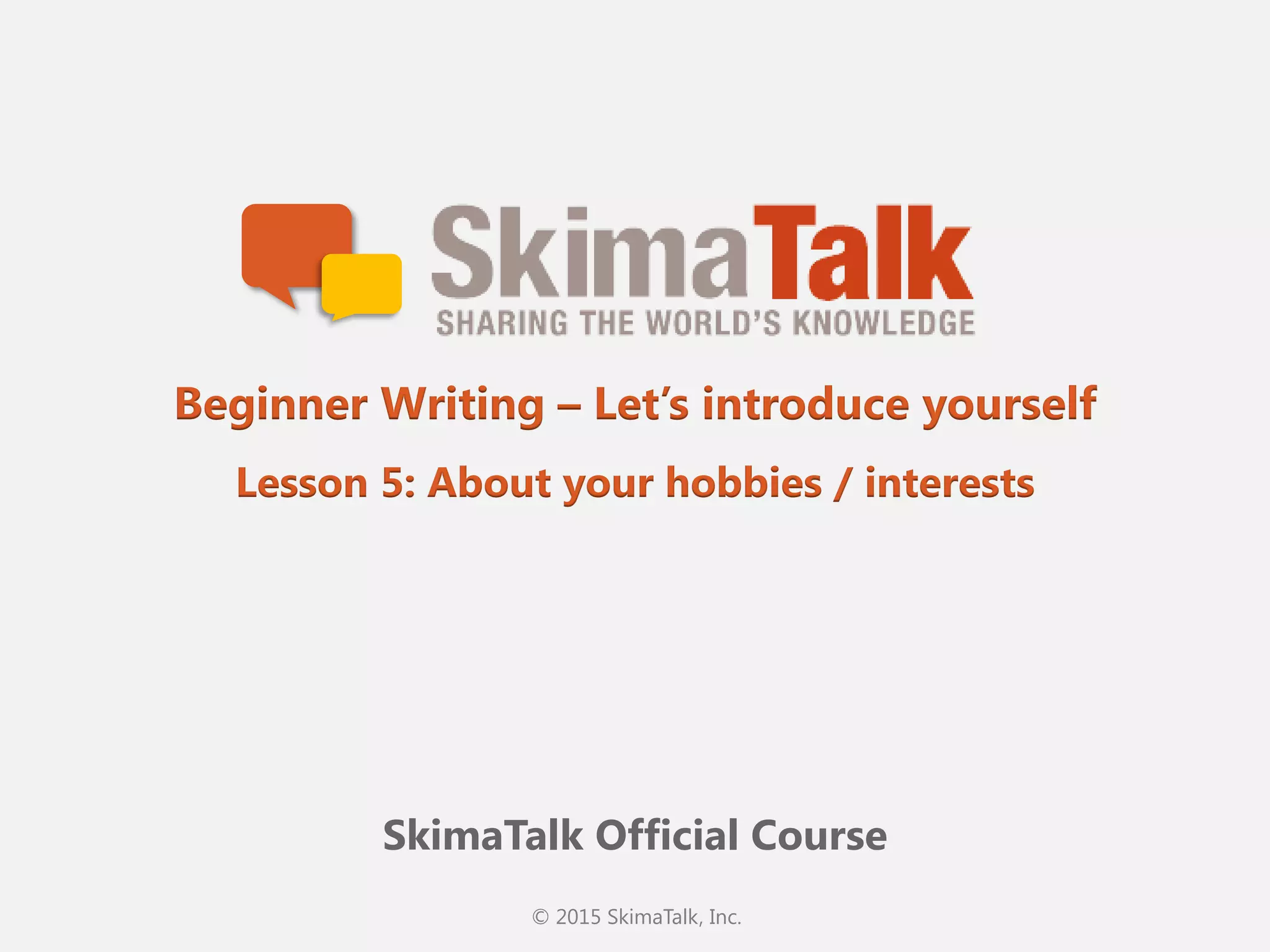 This document provides instructions for a beginner writing lesson on introducing hobbies and interests. Students are asked to answer 5 questions about their favorite hobby or interest in under 300 characters each. They will then read their answers to their instructor during the lesson. The instructor will provide feedback and ask follow-up questions. The goal is to have students practice writing and talking about their hobbies and interests in English.