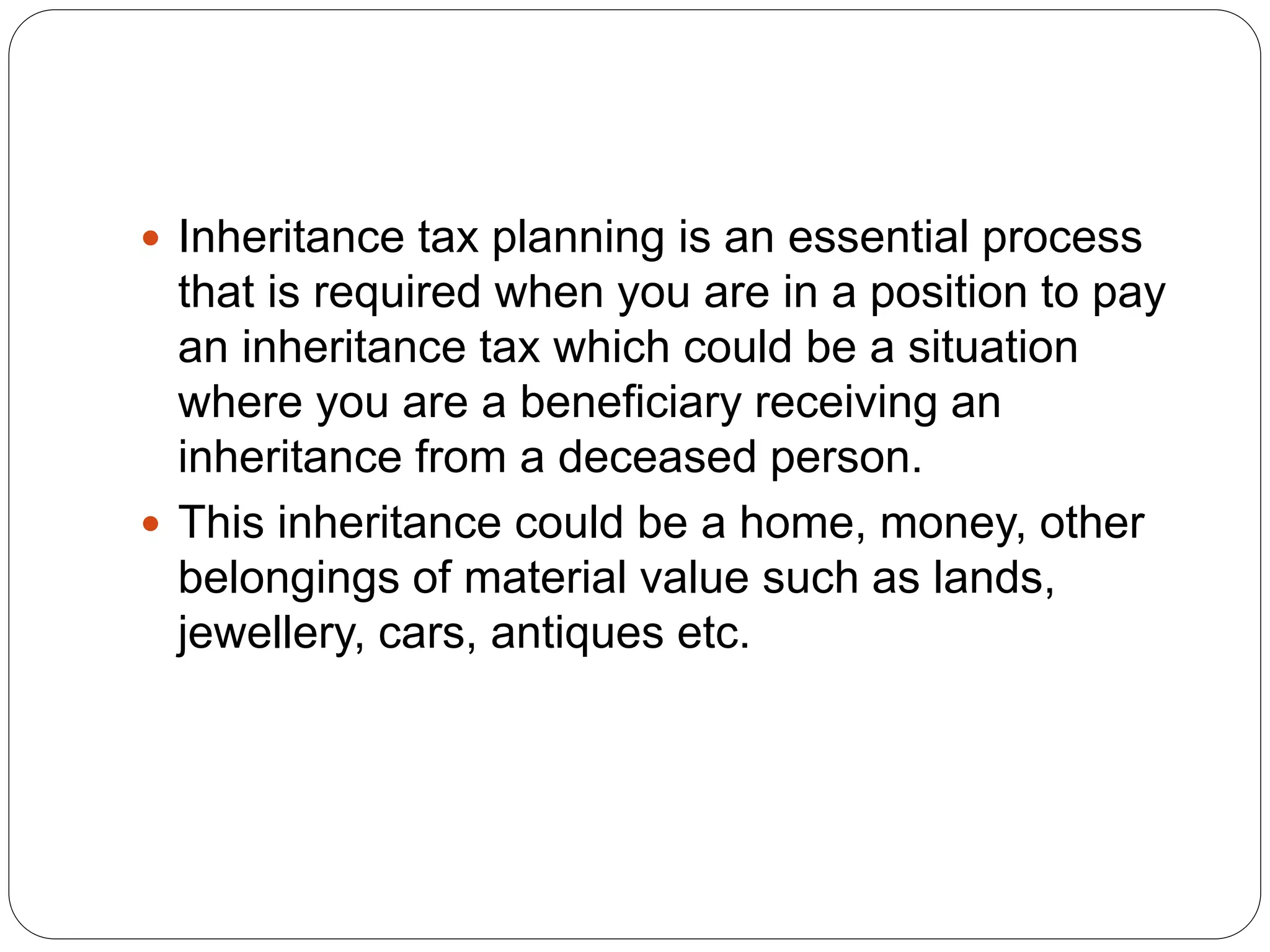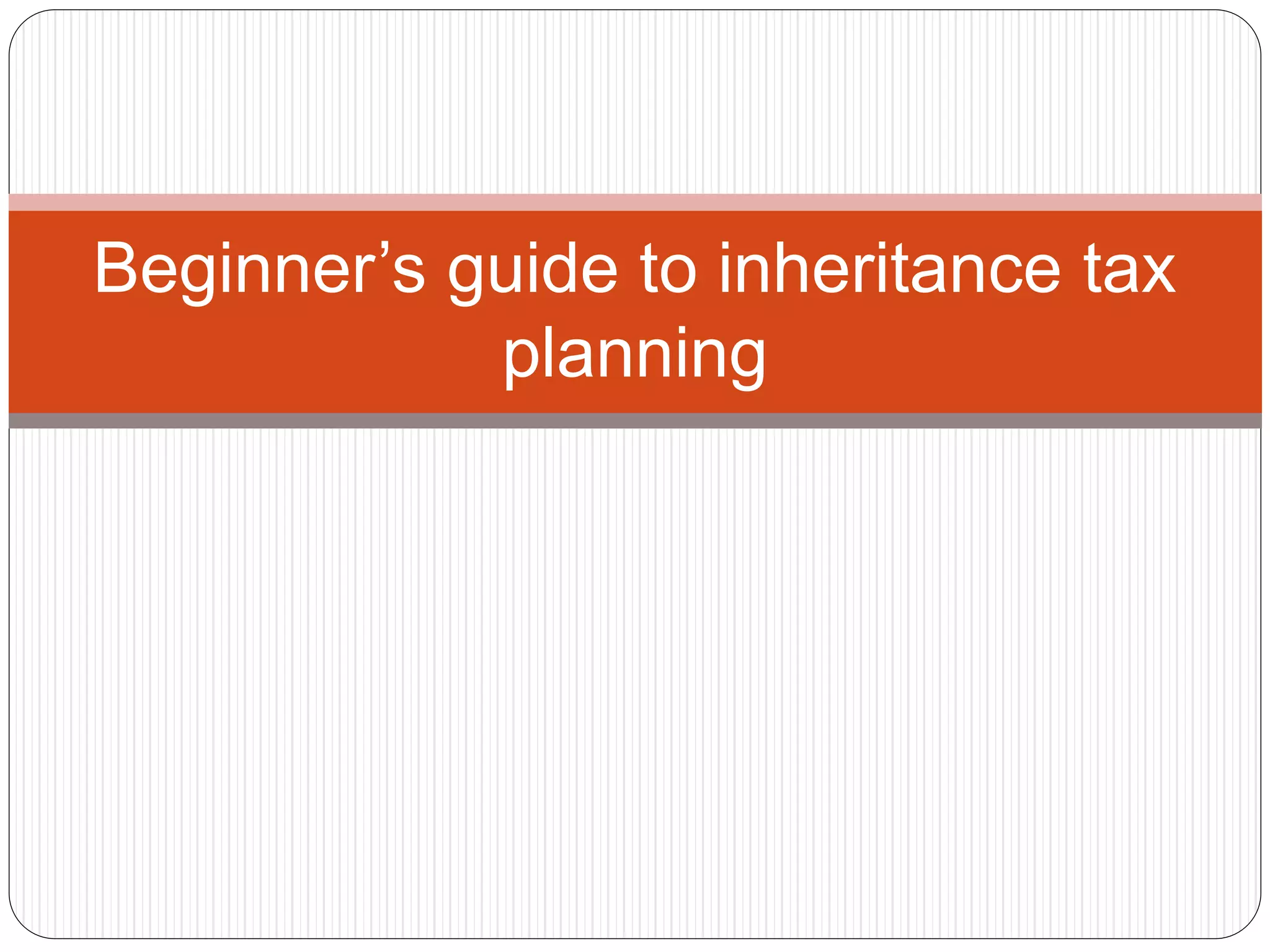 This document serves as a beginner's guide to inheritance tax planning, explaining the need for planning when receiving an inheritance and the applicable taxes. It covers essential topics such as inheritance tax thresholds, calculation of taxes, exemptions, and relief options like taper relief and trusts. The guide emphasizes understanding eligibility for exemptions to minimize tax burdens in the context of various relationships among beneficiaries.