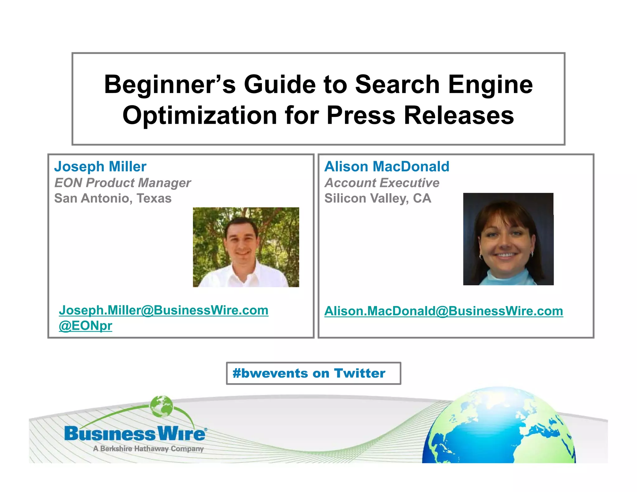 This document is a beginner's guide to search engine optimization (SEO) specifically for press releases, detailing the importance of SEO in increasing website traffic and visibility. It covers strategies for keyword selection, optimizing headlines and body content, and the inclusion of multimedia for enhanced engagement. The guide emphasizes the need for meticulous optimization for better search engine rankings and offers practical tips for crafting effective press releases.