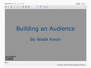 Building an audience for a blog is important to enrich content, attract sponsors, and sustain blogging over the long run towards ultimate goals. The key is to write frequently, plan ahead with idea lists, and post a variety of content like stories, questions, slideshows and videos. Interact with commenters, conduct polls to engage readers, and network by reading and commenting on other blogs to build connections. Use "sticky" techniques to keep readers engaged like related posts and newsletters. The right audience size is interactive fans, not millions of casual viewers.