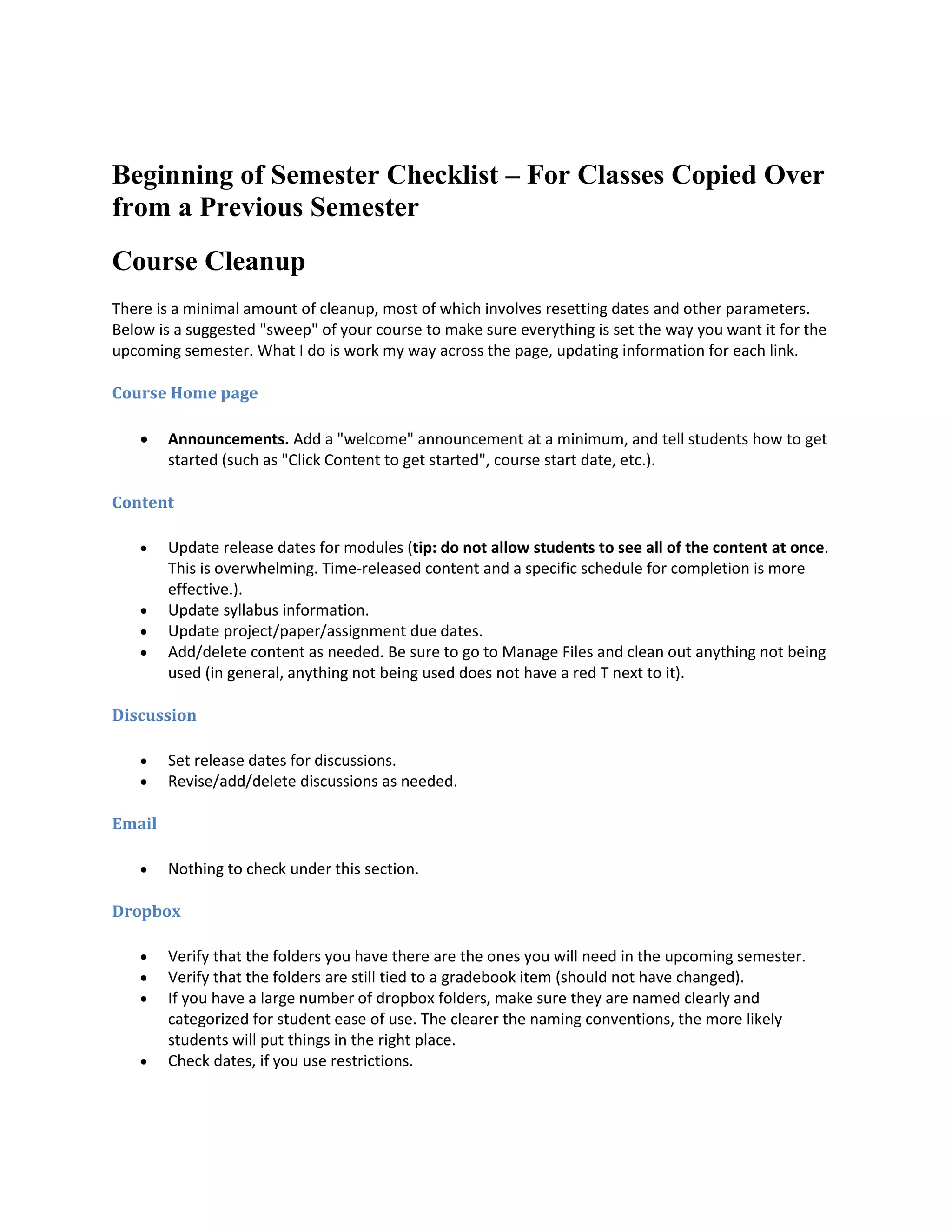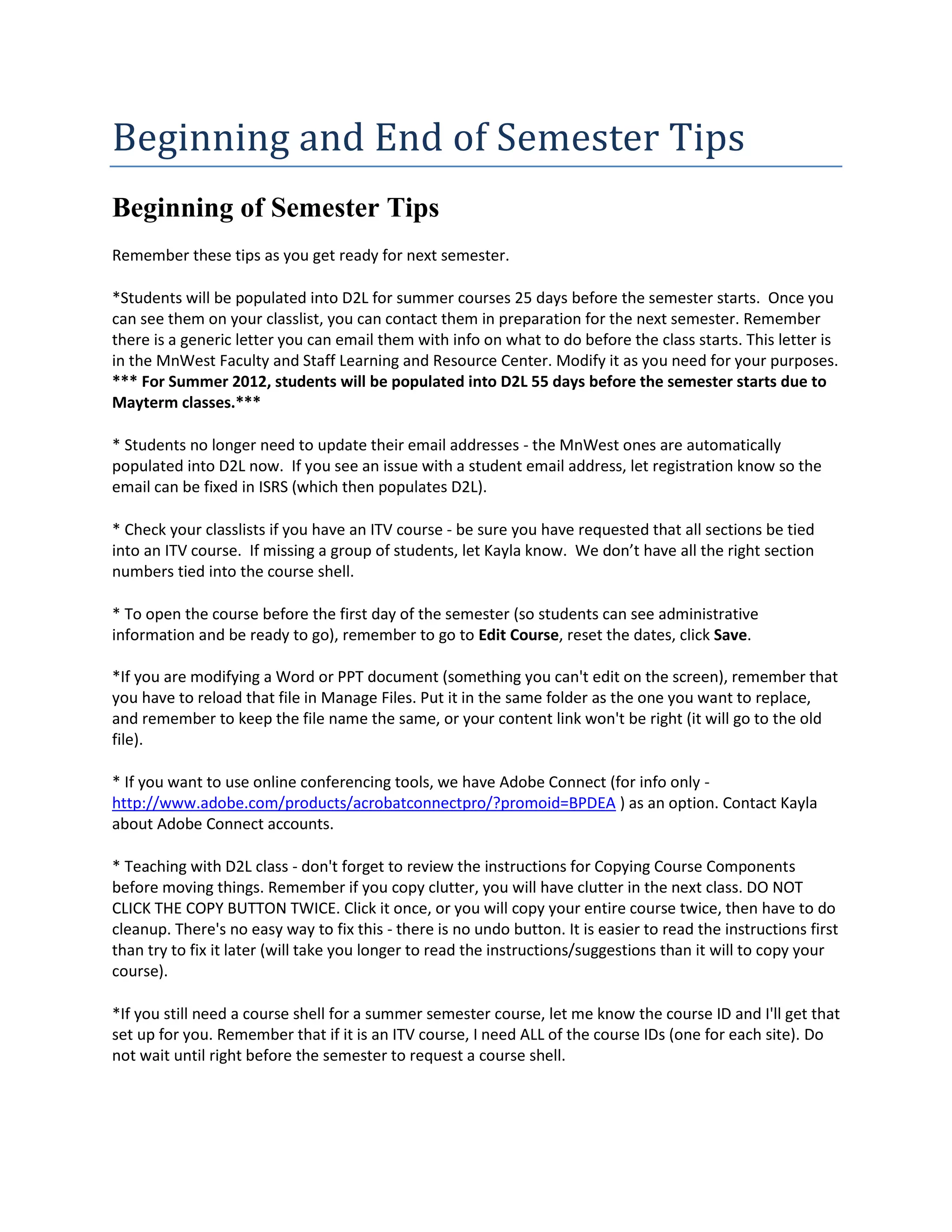 The document provides tips for faculty at the beginning and end of the semester for using Desire2Learn (D2L). At the beginning of the semester, faculty are advised to contact students via D2L 25 days before classes start, check class lists, and open courses early. They are also reminded how to use content, discussions, quizzes, and other tools. At the end of the semester, faculty should extend course end dates if needed, transfer grades, export grades and courses, and review instructions for copying courses to the next semester.