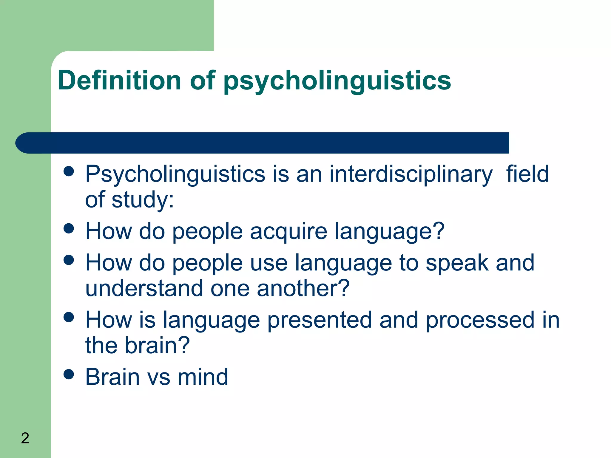 This document provides an overview of psycholinguistics and related topics. It defines psycholinguistics as the study of how people acquire, use, and process language in the brain. It discusses how psycholinguistics relates to other fields like psychology, linguistics, and neuroscience. It also covers key concepts like linguistic competence vs performance, the relationship between speech sounds and meaning, and the origins of modern psycholinguistics as a field of study.