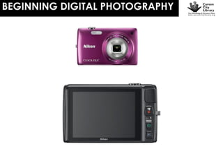 This document provides information about a beginning digital photography class presented by Sena Loyd, the Digital Learning Center Manager at the Carson City Library. The class will cover the basics of digital photography and using a digital camera. Sena Loyd can be contacted at sloyd@carson.org or 775-887-2244 x1018 for more information about the class.