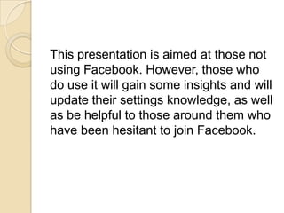 This presentation provides an overview of how to safely get started with Facebook. It discusses that Facebook has over 1.23 billion active users and highlights reasons for using Facebook, such as connecting with friends and following interests. It then covers how to create an account and customize privacy settings to control who can see posts, photos, and friend lists. The presentation demonstrates Facebook's privacy tools and settings for advertisements, apps, and security. It emphasizes being cautious of sharing personal information and photos publicly due to risks of job loss, expensive data charges, or photos being copied and shared without consent.