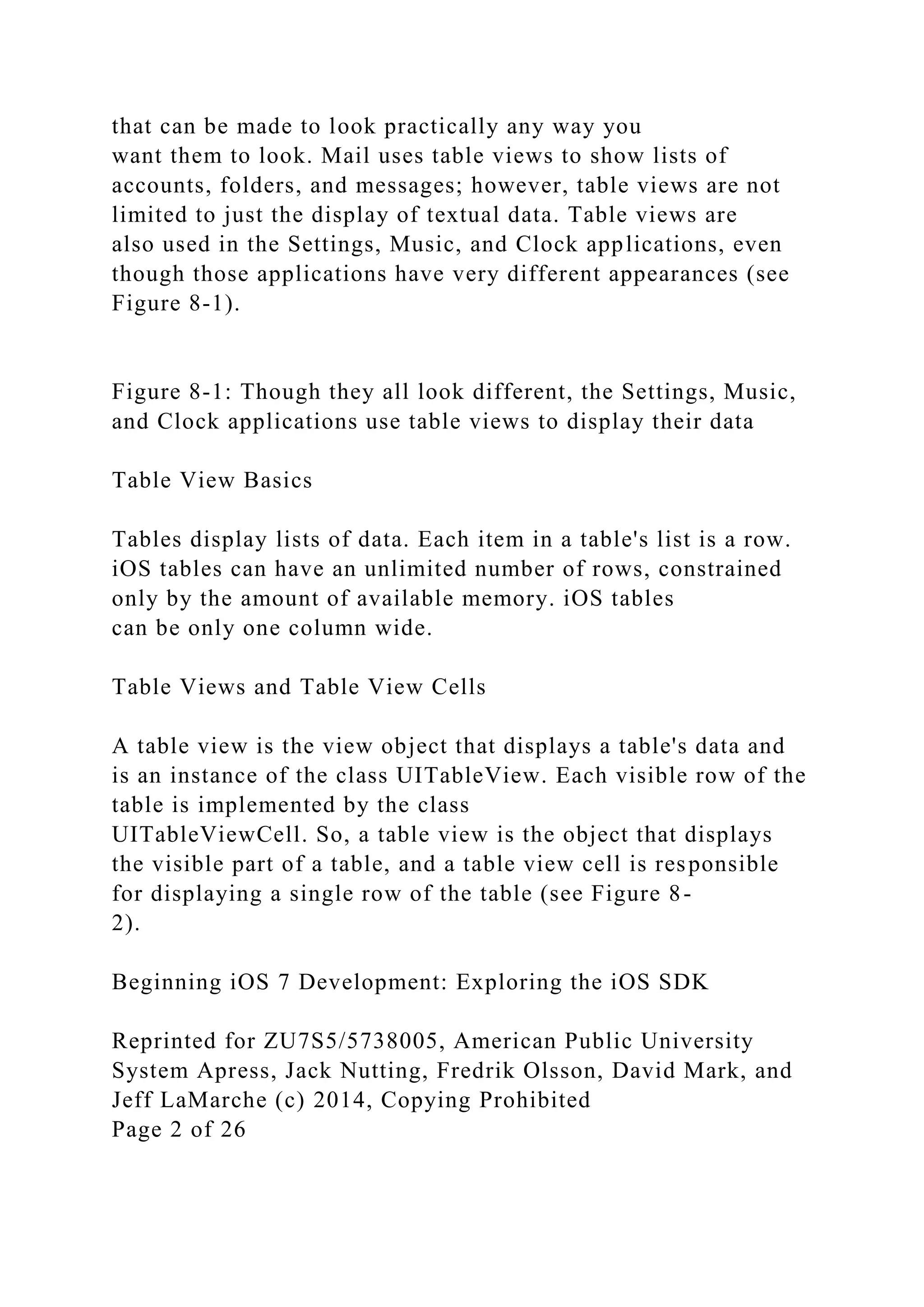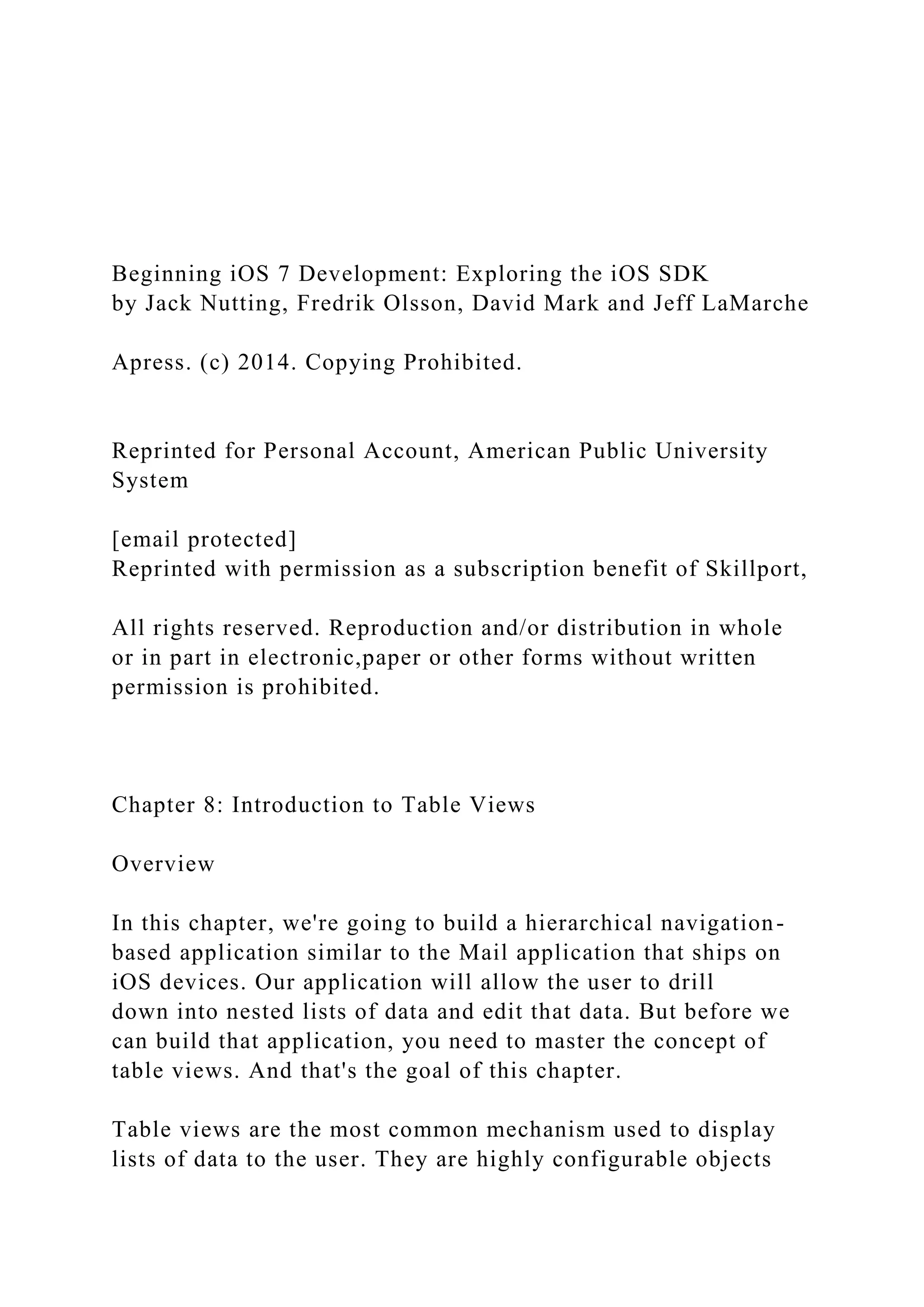 Chapter 8 of 'Beginning iOS 7 Development' focuses on understanding and implementing table views in iOS applications, which are essential for displaying lists of data. The chapter covers the structure and configuration of table views, including their styles (grouped and plain), as well as the required delegate and data source protocols. Examples are provided to demonstrate creating a simple table view application using Xcode and managing data display efficiently with reusable table view cells.
