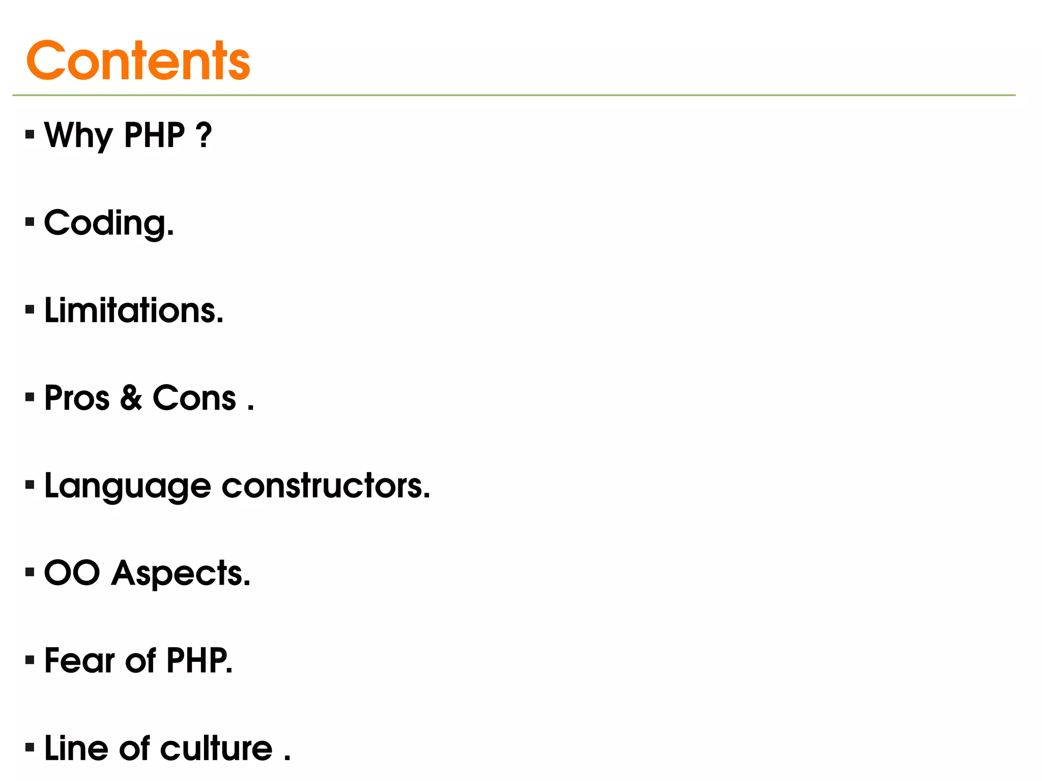 This document provides an overview of the PHP programming language. It discusses why PHP is a good choice for web programming due to its advantages over other languages like ASP, Java, and Perl. It also covers PHP coding, limitations, language constructs, object oriented aspects, arguments for and fears of PHP's OO approach, and emphasizes keeping things simple.