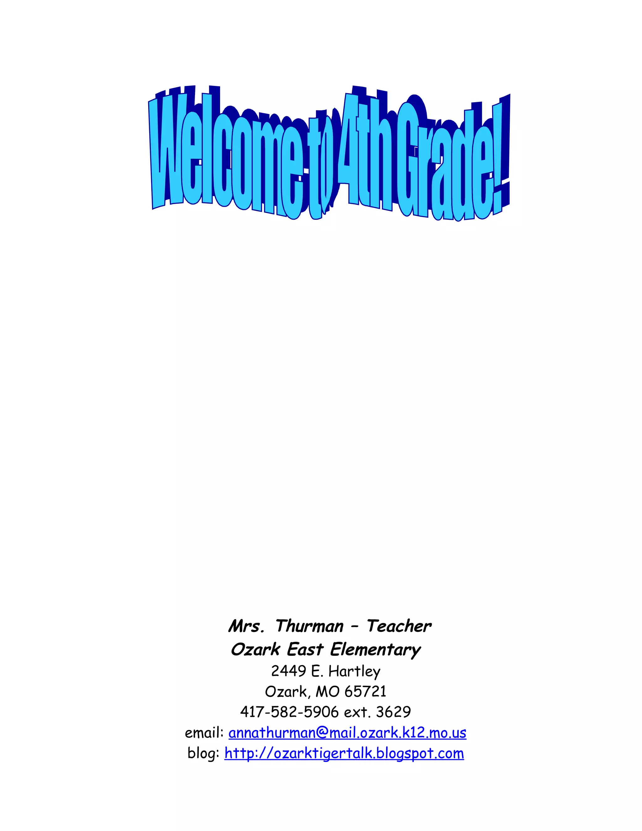This document provides information for parents of students in Mrs. Thurman's 4th grade class at Ozark East Elementary. It outlines policies and procedures for various aspects of the classroom from absences to homework. Key points include expectations for attendance, assigning missed work, use of assignment books to communicate homework, scheduling for special classes like art, music and PE, and encouraging parental involvement and open communication.