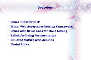 This document discusses automated web acceptance testing using Behat and Mink. It provides an overview of Behat, a behavior-driven development framework for PHP, and Mink, a web acceptance testing framework. It then covers setting up a Behat project with Mink, writing feature files, implementing step definitions, running tests locally and on Sauce Labs. It also discusses using Relish for living documentation and integrating tests with Jenkins.