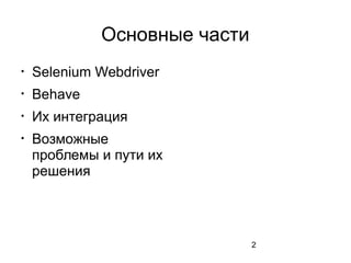 Документ описывает использование библиотеки behave и Selenium WebDriver для тестирования веб-проектов, включая интеграцию, структуру файлов и основные компоненты. Он также рассматривает сценарии тестирования, обработку шагов и решение возможных проблем, таких как время прохождения тестов и их зависимость. В заключение приведены ссылки на полезные ресурсы и примеры кода, демонстрирующие применение этих инструментов.