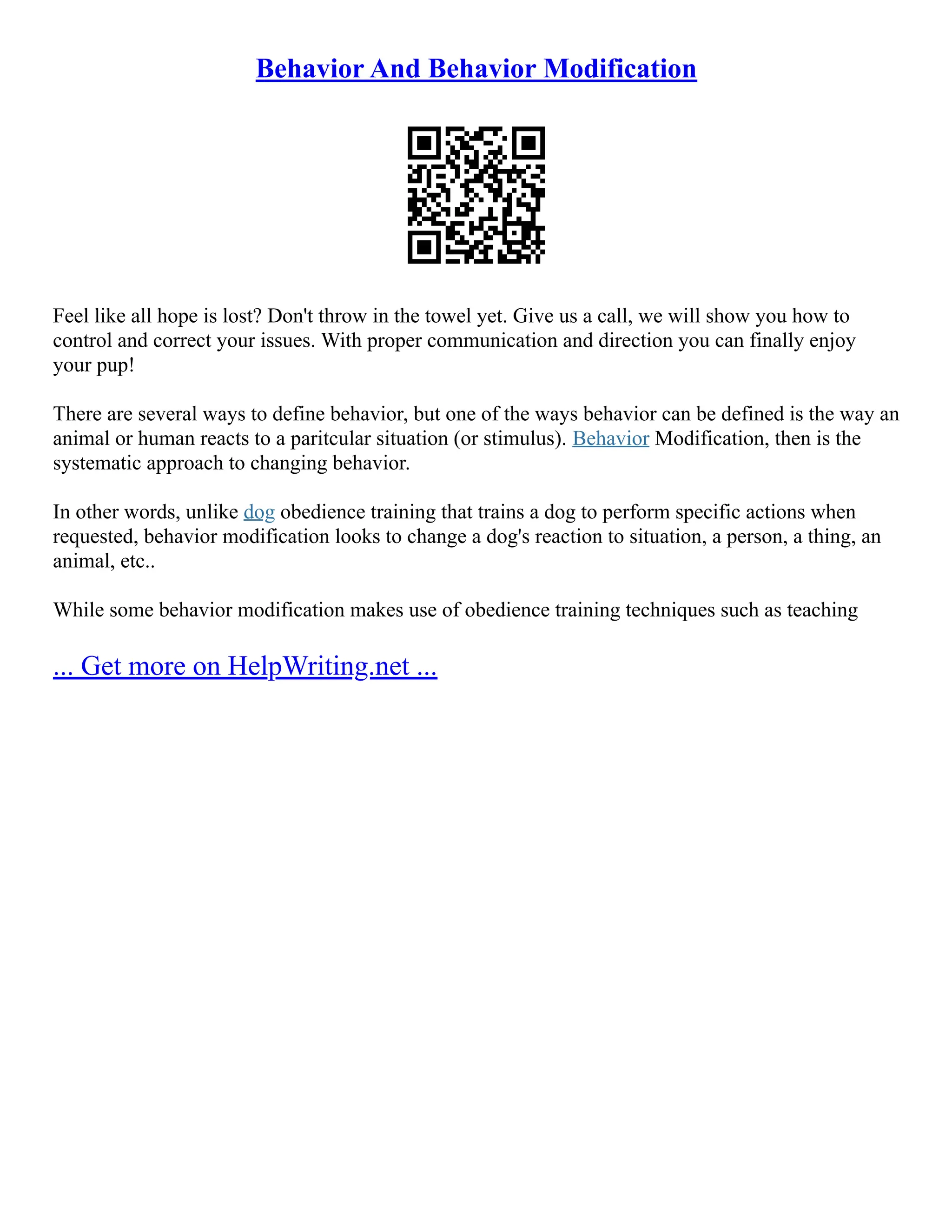 The document discusses behavior and behavior modification, defining behavior as how an animal or human reacts to a situation. It explains that behavior modification aims to systematically change behaviors by looking at how to alter a person or animal's reaction to specific stimuli, situations, or people. The document also notes that while some behavior modification uses obedience training techniques, its overall goal is to modify underlying reactions rather than just teaching specific commands.