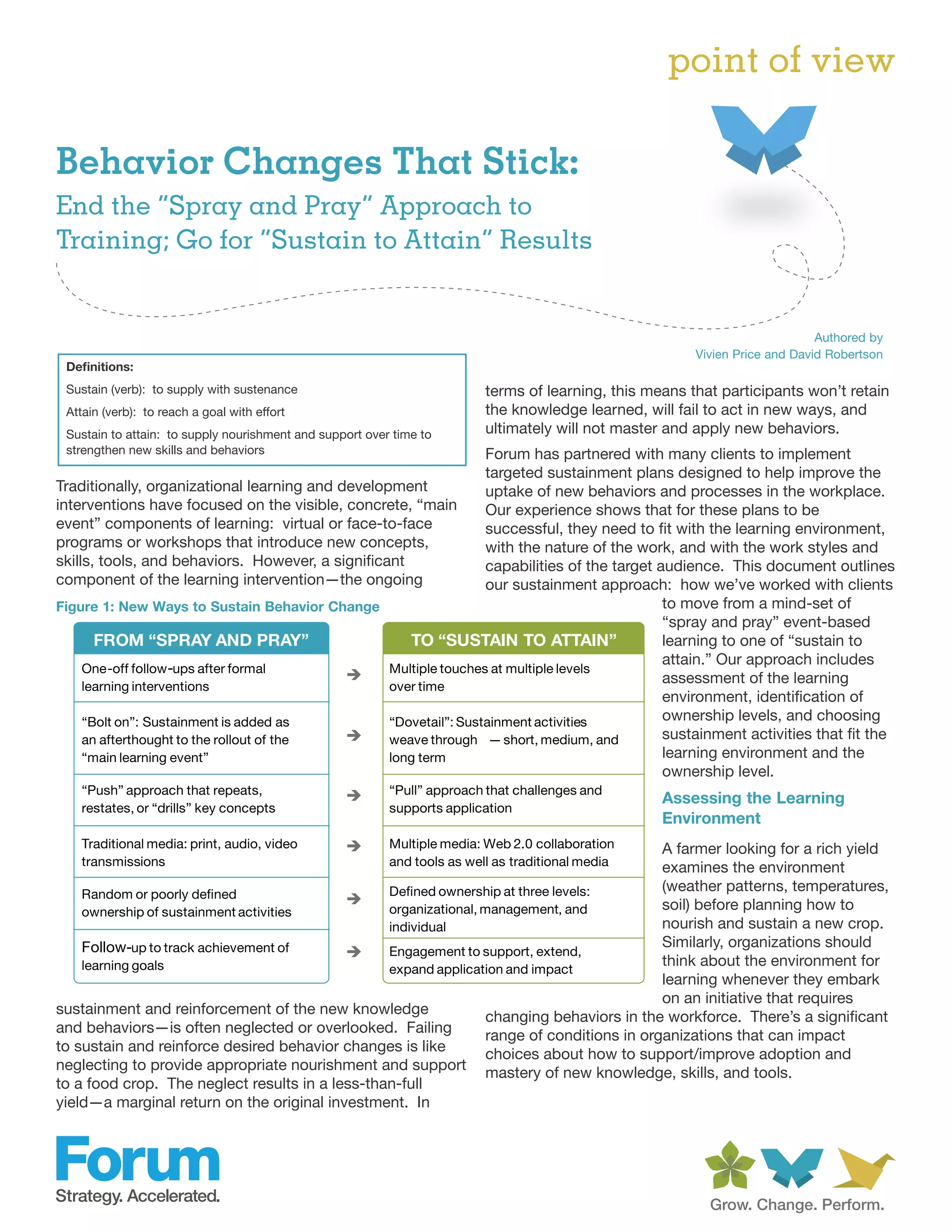 The document discusses the transition from event-based training methods to a 'sustain to attain' approach, emphasizing the need for ongoing support to reinforce new skills and behaviors in the workplace. It highlights the importance of aligning sustainment activities with the learning environment and employee ownership levels to ensure effective adoption and mastery of new knowledge. The proposal includes categorizing sustainment actions and creating tailored plans that focus on continuous improvement and performance enhancement.