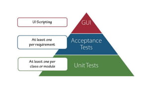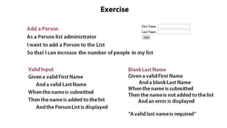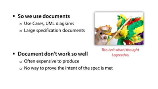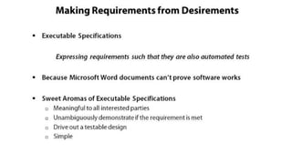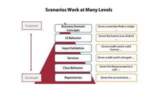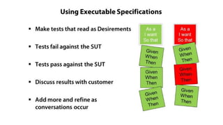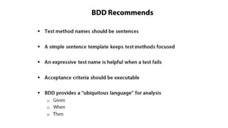 Behaviour Driven Development (BDD) is the natural evolution of test-driven development (TDD) that addresses challenges with poorly understood requirements, quality, and design. BDD uses examples written in a business-facing language to define requirements, automate functional tests, and improve communication between technical and business teams. BDD tests help improve software quality, design, and ensure requirements are fully implemented.