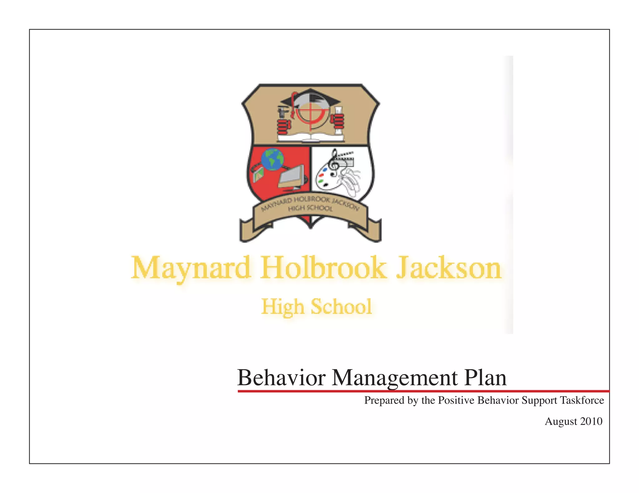 The behavior management plan developed by the Positive Behavior Support Taskforce aims to enhance behavioral consistency across three small learning communities at Maynard H. Jackson High School. It emphasizes positive reinforcement, a structured rewards system, and data-driven strategies to decrease behavioral incidents and improve student accountability. The plan also identifies concerns regarding supervision and accountability among staff, outlining specific interventions to address these issues.