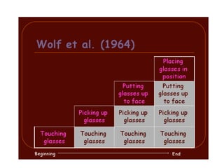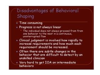 Shaping is a technique used to establish new behaviors through reinforcement of successive approximations. It involves defining a target behavior and breaking it down into gradual steps that reinforce closer approximations over time. Shaping is commonly used to train animals and rehabilitate human behaviors. Examples of how it is applied include teaching patients to increase time between bathroom visits or training an old man to walk using parallel bars in gradual steps from sitting to taking multiple steps of support. Guidelines for effective shaping specify selecting a desired behavior and reinforcer, then reinforcing mastery of each step before moving to the next approximation.