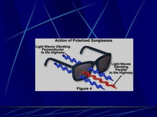 Reflection occurs when a wave bounces off a surface it cannot pass through. Refraction is when a wave bends as it passes from one medium into another at an angle, occurring because the wave slows down on one side compared to the other. Diffraction is the bending of a wave as it travels around or through an opening, with larger wavelengths diffracting more through smaller openings. Polarization occurs when unpolarized light is turned into polarized light that travels in one direction only, such as when light reflects off a flat surface. Scattering redirects light as it passes through a medium, causing the sky to appear blue and sunsets orange/red due to scattering