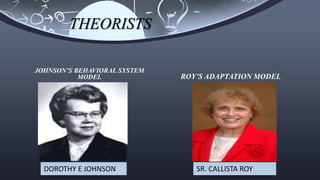 This document compares Dorothy Johnson's Behavioral System Model and Callista Roy's Adaptation Model of nursing. Johnson proposed her behavioral model in 1968 to advocate for fostering efficient patient functioning to prevent illness. Roy introduced Adaptation Nursing in 1964 with the goal of directing nursing education, practice, and research. Both models view the person as a system interacting with their environment. However, Johnson's model focuses on maintaining balance of behavioral subsystems while Roy's model emphasizes supporting the patient's adaptation process.