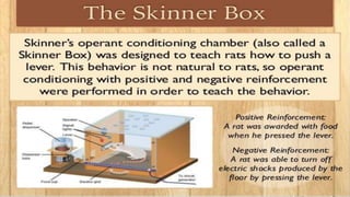 B.F. Skinner developed the theory of operant conditioning based on Thorndike's law of effect. Operant conditioning uses reinforcement and punishment to modify behavior. Reinforcement strengthens behaviors by providing rewards, while punishment weakens behaviors by introducing unpleasant consequences to reduce their likelihood in the future. Behavioral counselors apply techniques like reinforcement schedules, shaping, chaining, and generalization to help clients achieve therapeutic goals by changing their behaviors.