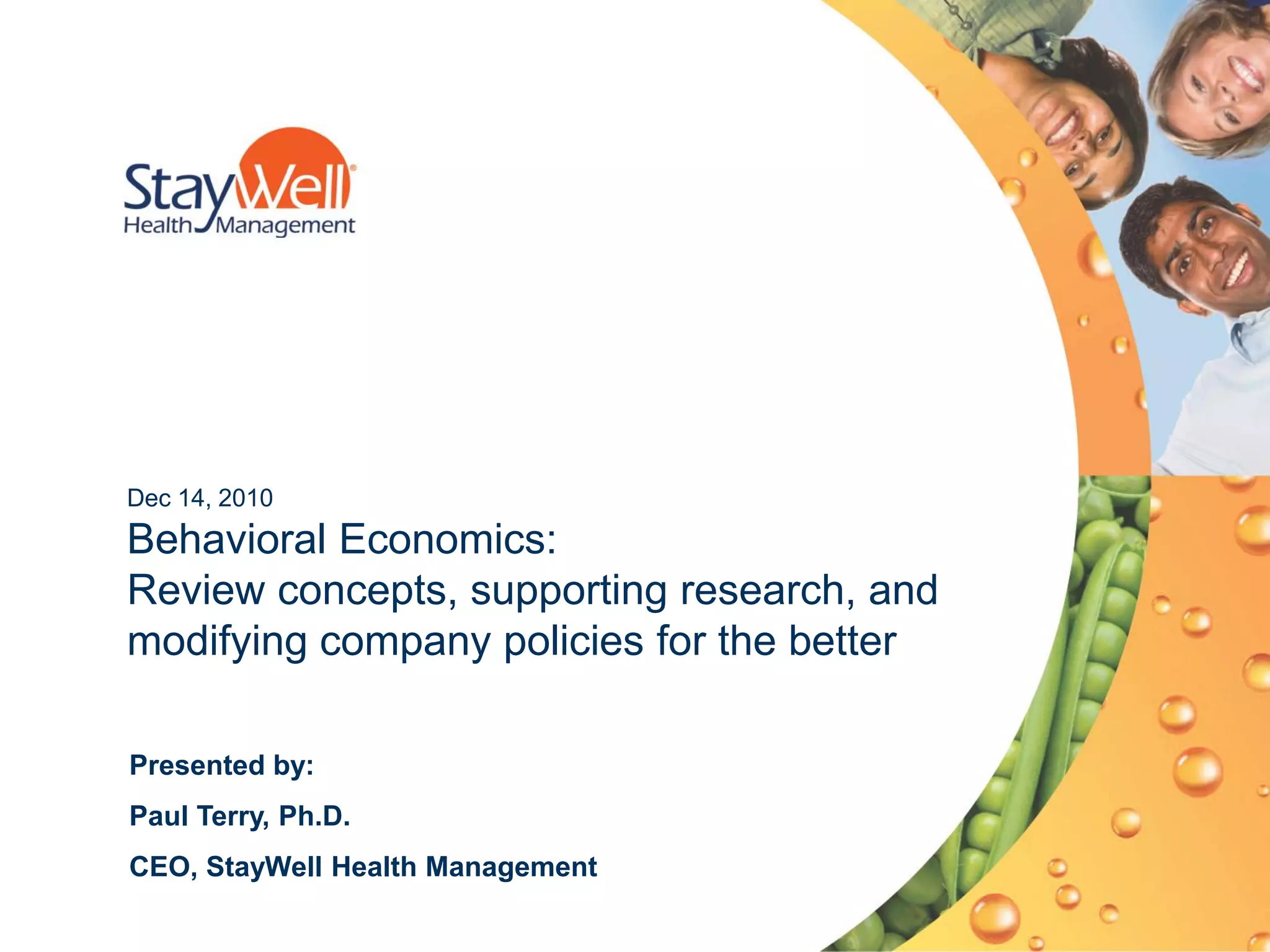 The document summarizes concepts from behavioral economics and supporting research on modifying company policies. It discusses choice architecture and how nudges can influence behavior through subtle changes rather than mandates. Research shows that financial incentives can significantly increase smoking cessation and weight loss rates compared to information alone. The presentation provides examples of company policies to analyze and discuss whether they constitute nudges, pushes, or kicks. The goal is to evaluate policies and work to improve any that go beyond nudges.
