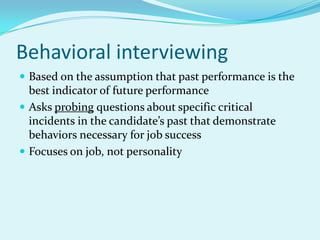Getting the Right People in the Right Seats on the Bus:Behavioral Interviewing discusses behavioral interviewing as a more effective interviewing technique than traditional interviewing. Behavioral interviewing is based on the assumption that past performance predicts future performance, and involves asking candidates about specific past experiences that demonstrate the key behaviors needed for the job. It has a 70% validity rate for predicting job success, compared to only 19% for traditional interviewing. The document provides guidance on developing behavioral interview questions focused on competencies required for the role.