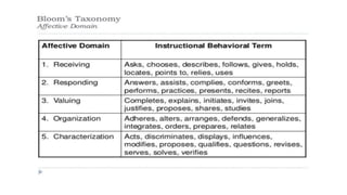 This document provides information about lesson plans and how to write behavioral objectives for lesson plans. It discusses the key components of a lesson plan including objectives, subject matter, procedures, evaluation, and assignments. It also outlines Bloom's Taxonomy for categorizing educational objectives into cognitive, affective, and psychomotor domains. Specific guidelines are provided for writing measurable behavioral objectives, including specifying conditions, behaviors, and criteria. Key aspects like making objectives SMART (Specific, Measurable, Attainable, Relevant, Time-bound) are also covered.