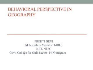- Behavioral geography is an approach that studies human activity, place, and environment at the individual level. It aims to understand human behavior by examining psychological processes like perceptions, decision making, and environmental images.