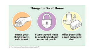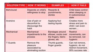 This document provides information on common behavioral problems in children. It discusses causes of behavioral disorders like faulty parental attitudes, inadequate family environment, and influence of social relationships. It describes types of behavioral problems stemming from emotional, physical, and social deprivation including temper tantrums, bedwetting, thumb sucking, and more. Assessment and management strategies are outlined for each condition. The document emphasizes the importance of parental support, clear communication, and developing a child's independence and social skills to address behavioral issues.