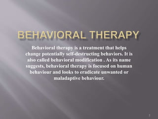 Behavioral therapy aims to change maladaptive behaviors by focusing on environmental factors that influence behavior, rather than internal mental processes. It is based on the work of psychologists like Pavlov, Watson, Skinner and involves techniques like systematic desensitization, modeling, exposure therapy, and stimulus control therapy. Behavioral therapists believe all behaviors are learned and can be unlearned, focusing on observable behaviors over internal experiences.