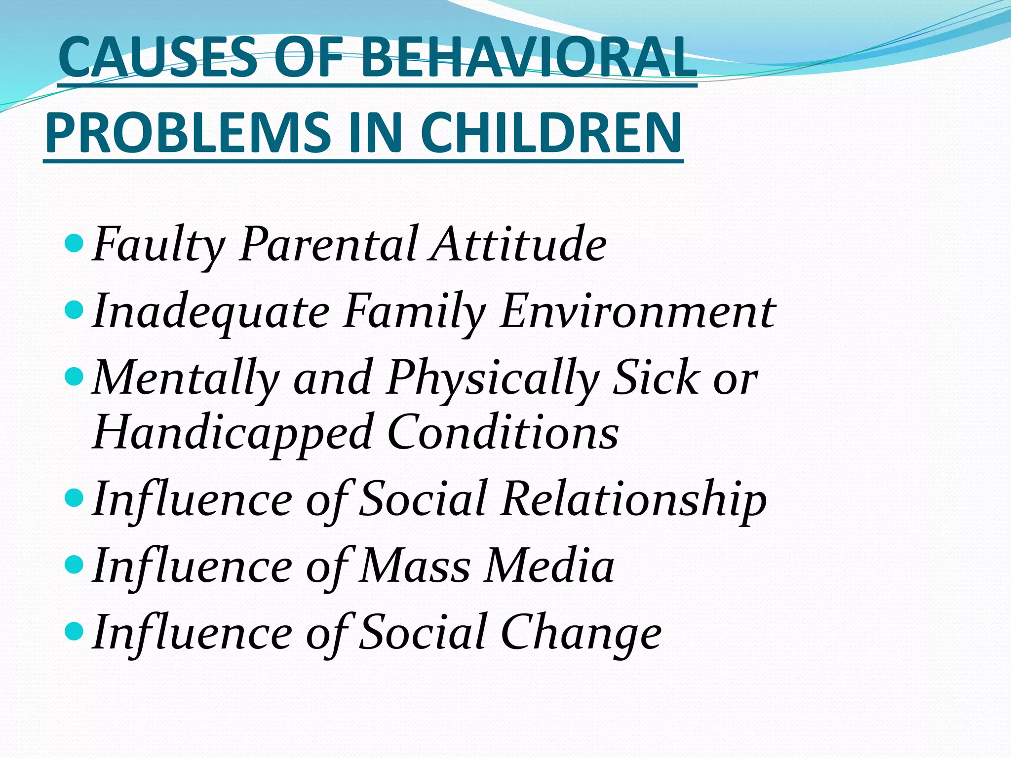 This document discusses various behavioral problems in children including causes, common problems, and management strategies. It covers problems in infancy such as feeding issues and temper tantrums. Common behavioral issues are listed along with speech problems, enuresis, encopresis, pica, tics, and other issues. For each problem, contributing factors and recommended management approaches are provided. The document provides a comprehensive overview of behavioral problems in children.