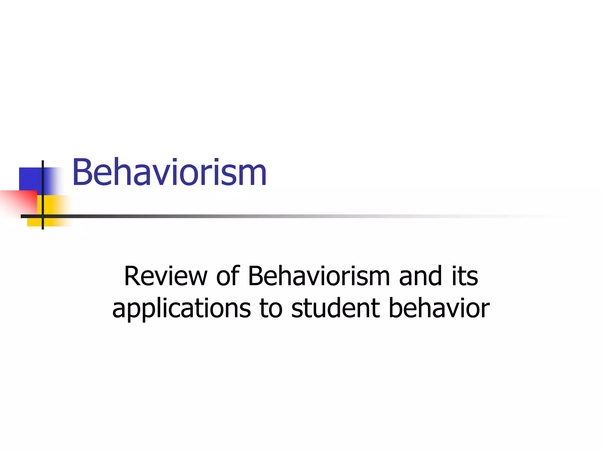 The document discusses behaviorism and its key principles including classical conditioning, operant conditioning, reinforcement, and punishment. It also covers applications of behaviorism such as language development, morality, aggression, and gender development. Finally, the document discusses social learning theory and how children develop self-efficacy through mastery experiences, modeling, verbal persuasion, and emotional states.