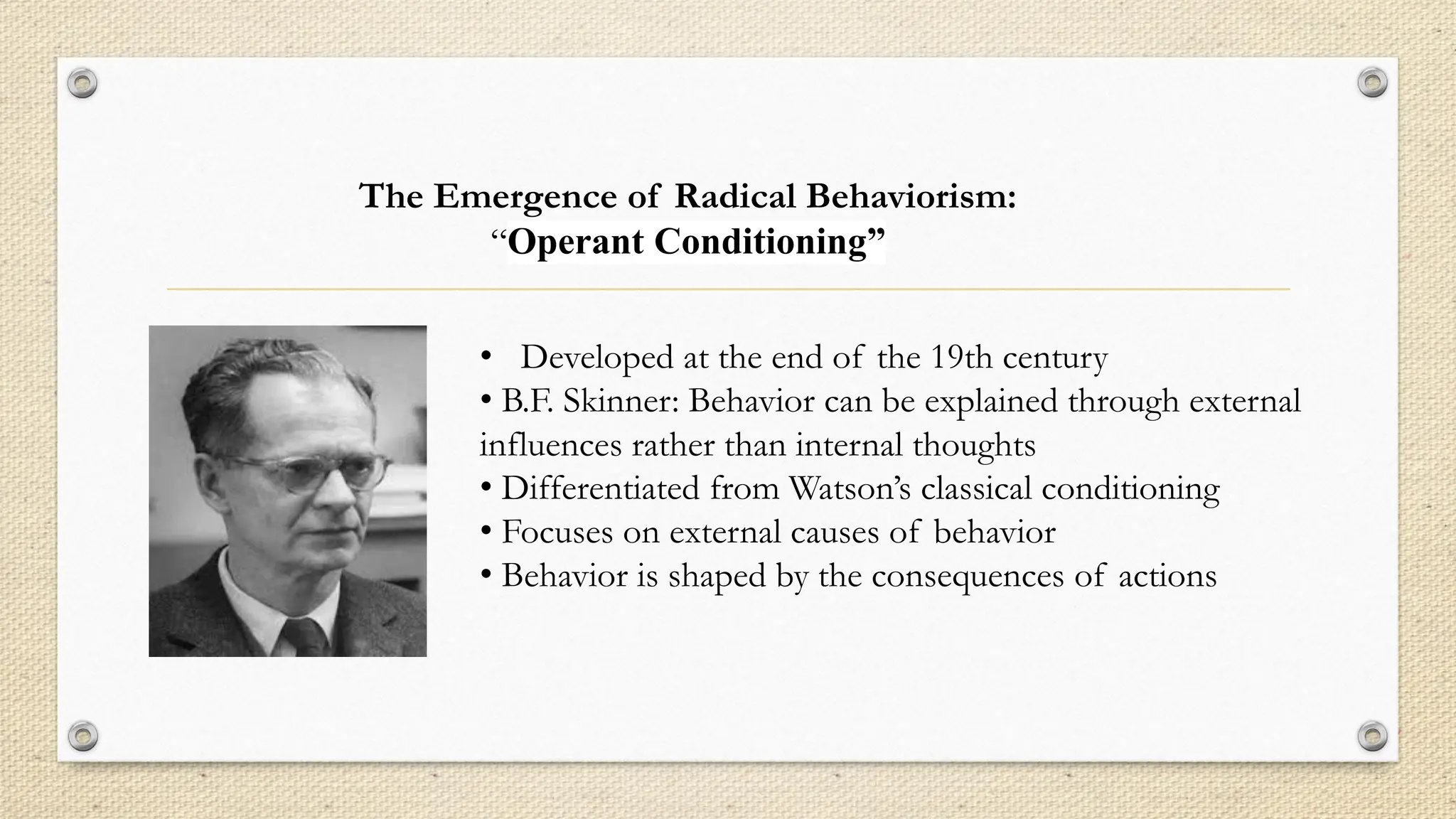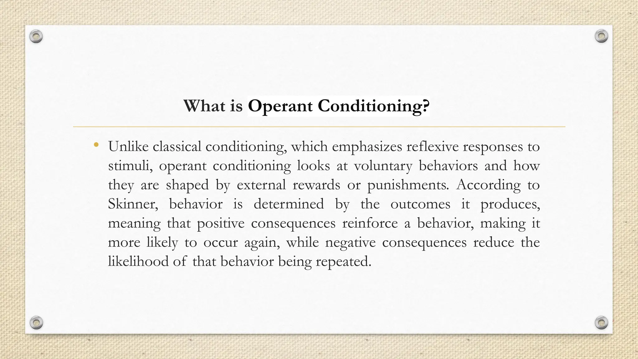 The document discusses the principles of operant conditioning as developed by B.F. Skinner, focusing on how behavior is influenced by external rewards and punishments. It differentiates between types of reinforcement and punishment, emphasizing their effects on behavior and providing examples for clarity. Additionally, it touches on the concepts of extinction, generalization, and discrimination within operant conditioning, as well as the implications for behavior modification and alternatives to punishment.
