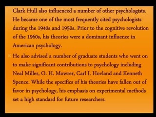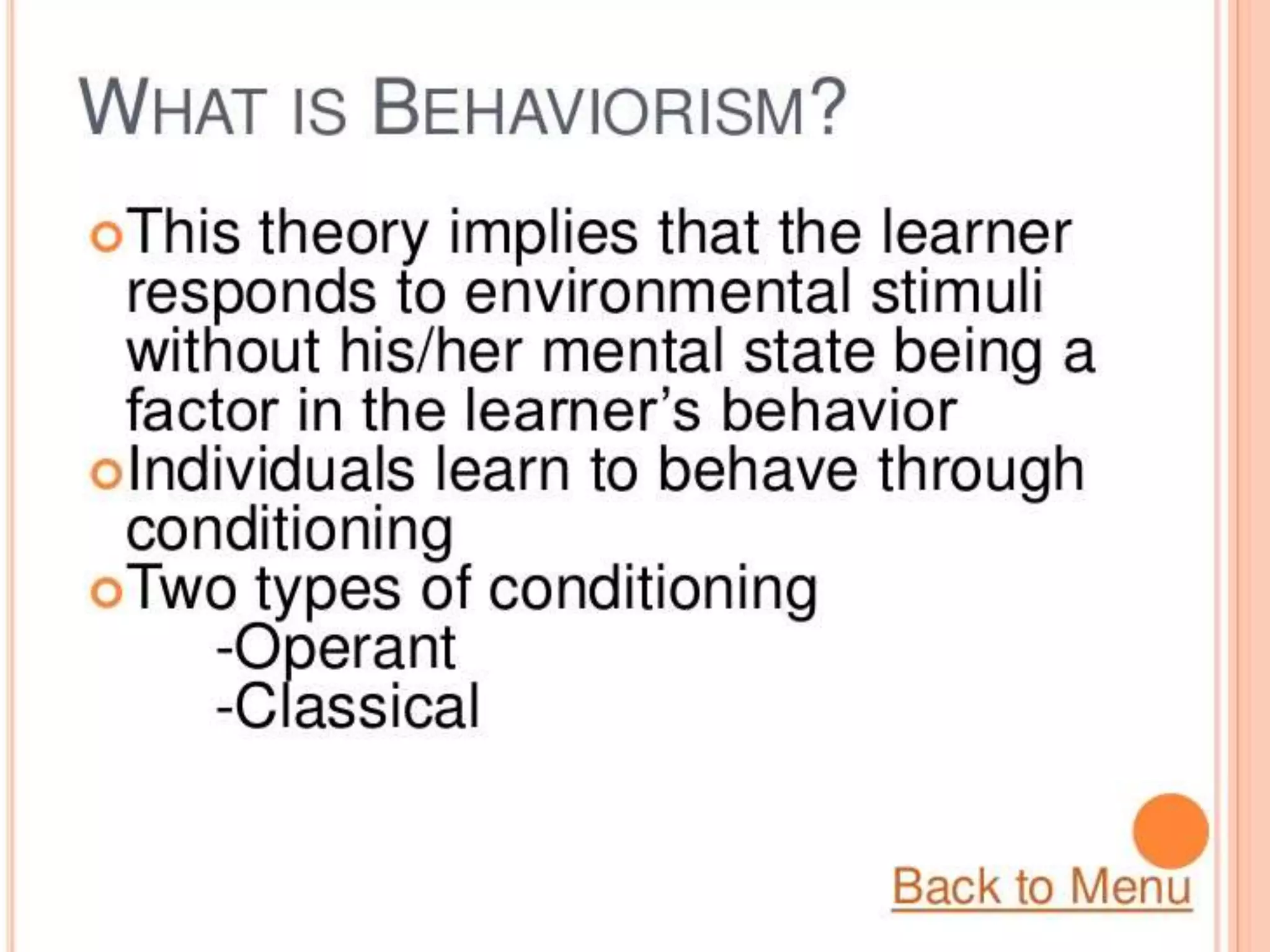 Major theorists in behaviorism include John B. Watson, Ivan Pavlov, Edward Thorndike, B.F. Skinner, and Clark Hull. Behaviorism is based on the idea that all behaviors are acquired through conditioning, and can be studied systematically through interaction with the environment without consideration of internal mental states. The two major types of conditioning are classical conditioning, involving learned associations between stimuli, and operant conditioning, where behaviors are associated with consequences like rewards and punishments.