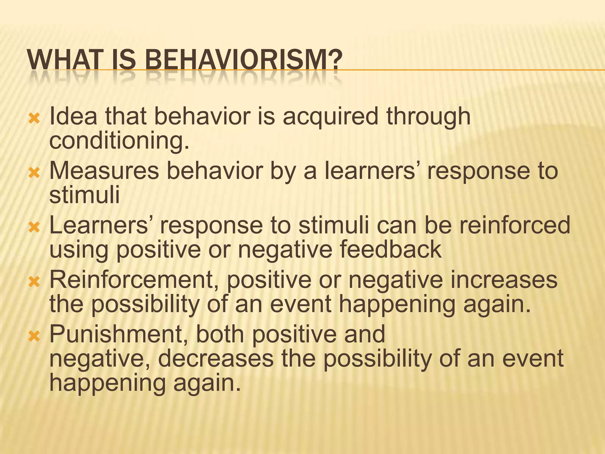 Behaviorism theory proposes that all learning is based on conditioning responses to external stimuli. Key founders include John B. Watson, Ivan Pavlov, and B.F. Skinner. Their work established that learning occurs through reinforcement or punishment in response to stimuli, without consideration of internal mental processes. Teachers can apply behaviorism by using positive and negative reinforcement, testing specific skills, and focusing on individual work over group learning.