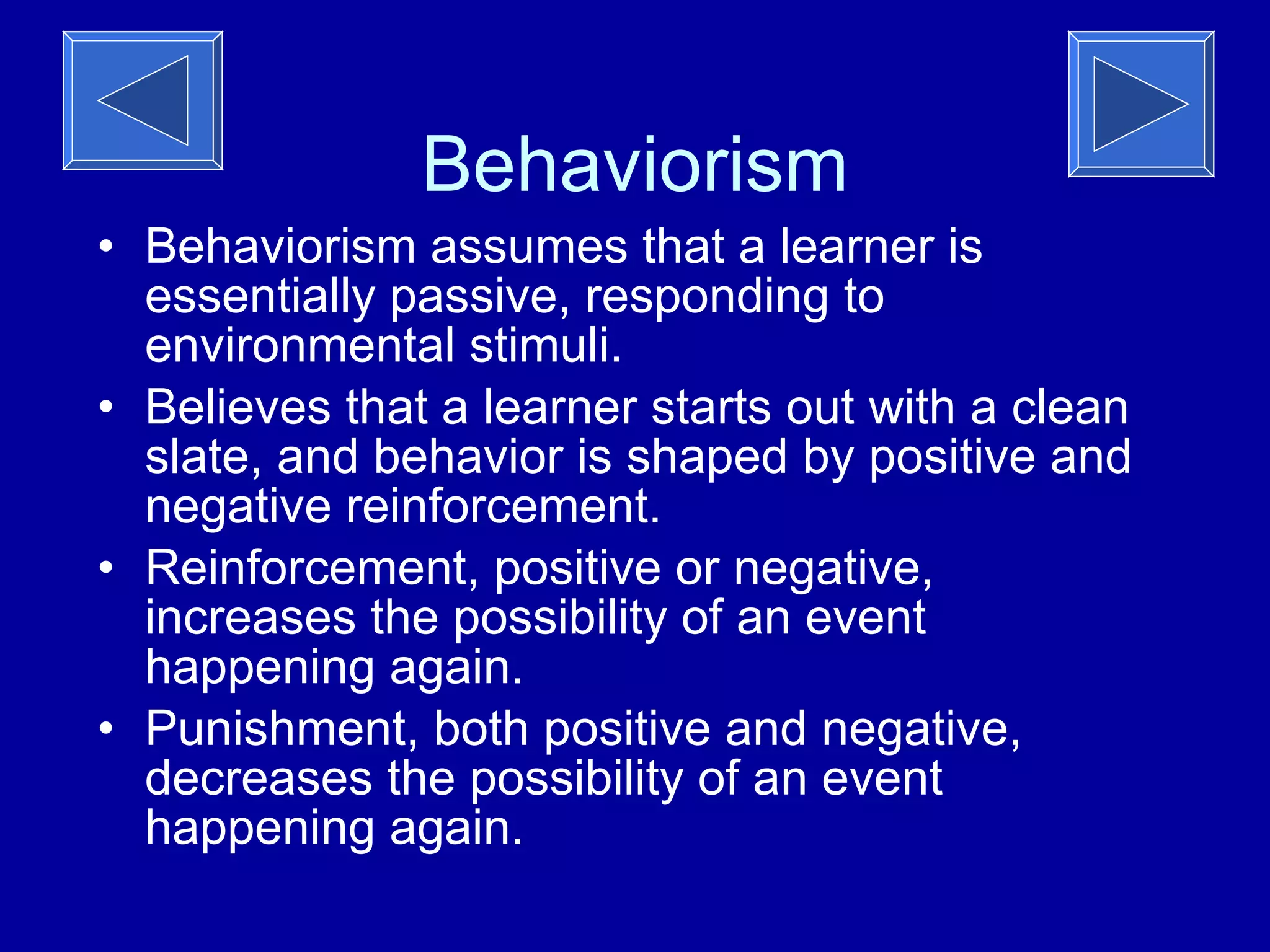 The document discusses the behaviorist theory of learning. [1] Behaviorism assumes that learning is influenced by environmental stimuli and responses are reinforced through positive and negative consequences. [2] Important behaviorist theorists include Ivan Pavlov, who studied classical conditioning in dogs, and B.F. Skinner, who developed operant conditioning using reinforcement and punishment. [3] Teachers can apply behaviorist principles in the classroom by breaking tasks into small steps, providing clear instructions, and using positive reinforcement.