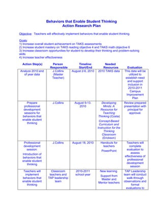 1) Teachers will implement behaviors that enable student thinking to increase student achievement and mastery in reading and math.