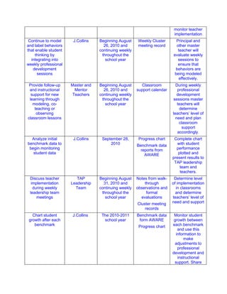 2) The action plan includes analyzing student performance data, providing teacher professional development, modeling behaviors in classrooms, and monitoring student progress through benchmark assessments.