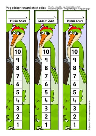 This document provides instructions for creating a sticker chart reward system for students. Teachers are instructed to punch holes at the top of printed sticker charts and string them together to hang on student pegs. The charts include spaces to place 10 stickers to reward students reaching goals over time.
