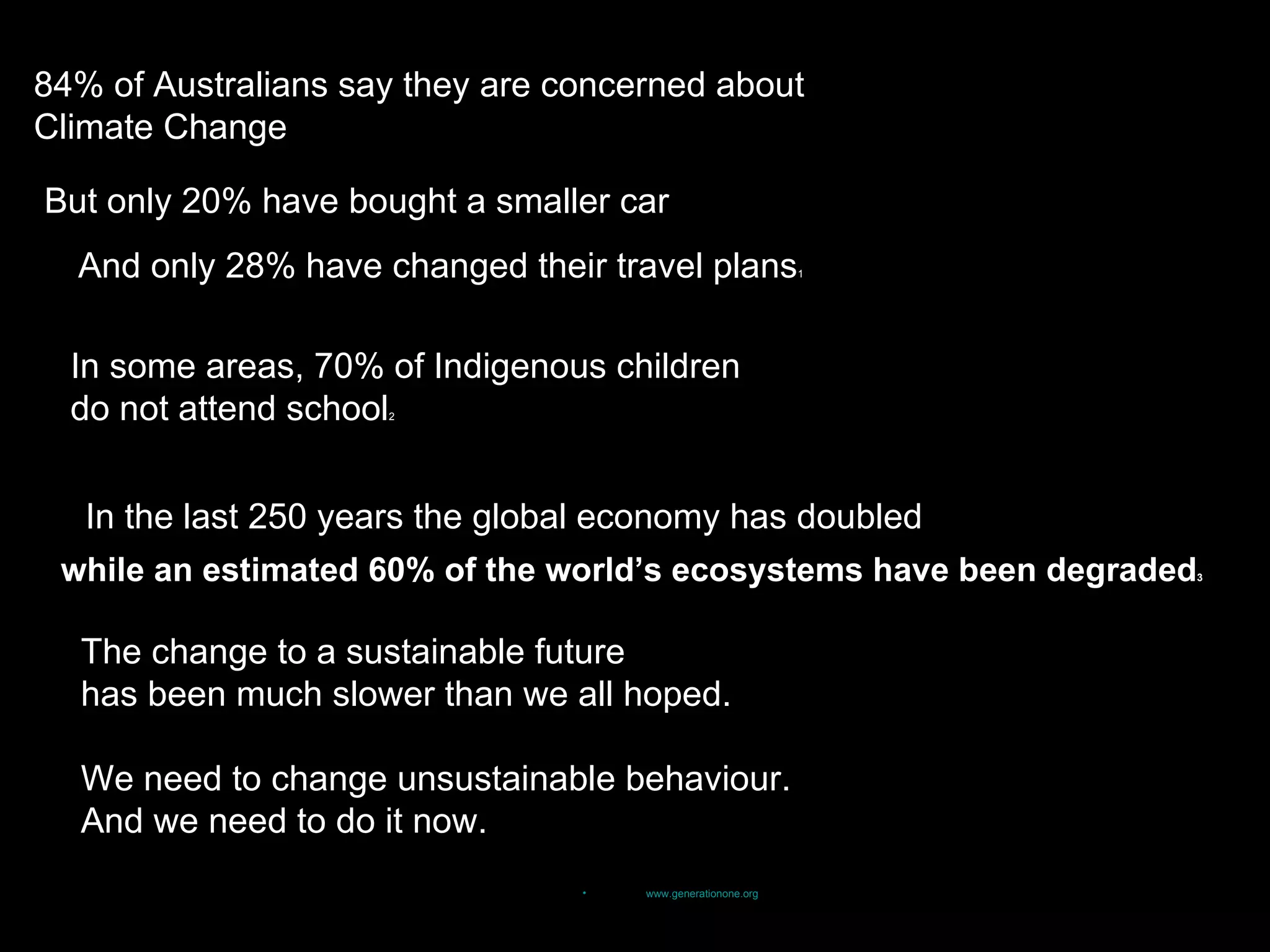 While most Australians are concerned about climate change, few have made significant lifestyle changes to reduce their environmental impact. Indigenous school attendance remains low in some areas. The global economy has expanded rapidly in recent centuries, but progress toward sustainability has been slower. Most of the world's ecosystems are now degraded. To avoid further damage, unsustainable behaviors must change quickly. An upcoming conference will bring together experts to help attendees turn sustainability knowledge into meaningful action.