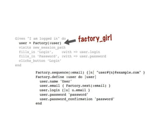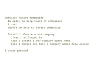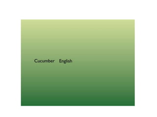 This document discusses Behavior Driven Development (BDD) using Cucumber and RSpec. It introduces BDD and its benefits like increased collaboration, test-driven development, and describing requirements in natural language. Cucumber is presented as a BDD acceptance testing framework that uses plain text to describe test cases and scenarios. RSpec is described as a complementary BDD unit testing framework. The document advocates for the Red-Green-Refactor process and provides code examples of Cucumber features and scenarios as well as RSpec examples. Overall it presents BDD as a way to write automated tests using natural language for collaboration and executable documentation.