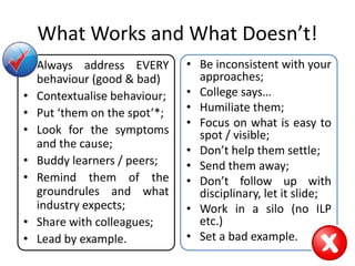 The document provides strategies for effective classroom behavior management. It recommends addressing all student behavior, understanding context, involving peers, setting clear expectations aligned with industry, sharing practices with colleagues, and leading by positive example. Ineffective strategies include being inconsistent, focusing only on visible problems, not assisting students, sending students away without follow up, and not collaborating with others. Key strategies shown to decrease disruptions are building positive teacher-student relationships, establishing clear rules and procedures, using disciplinary interventions appropriately, and developing self-awareness of one's mental state when responding to issues.