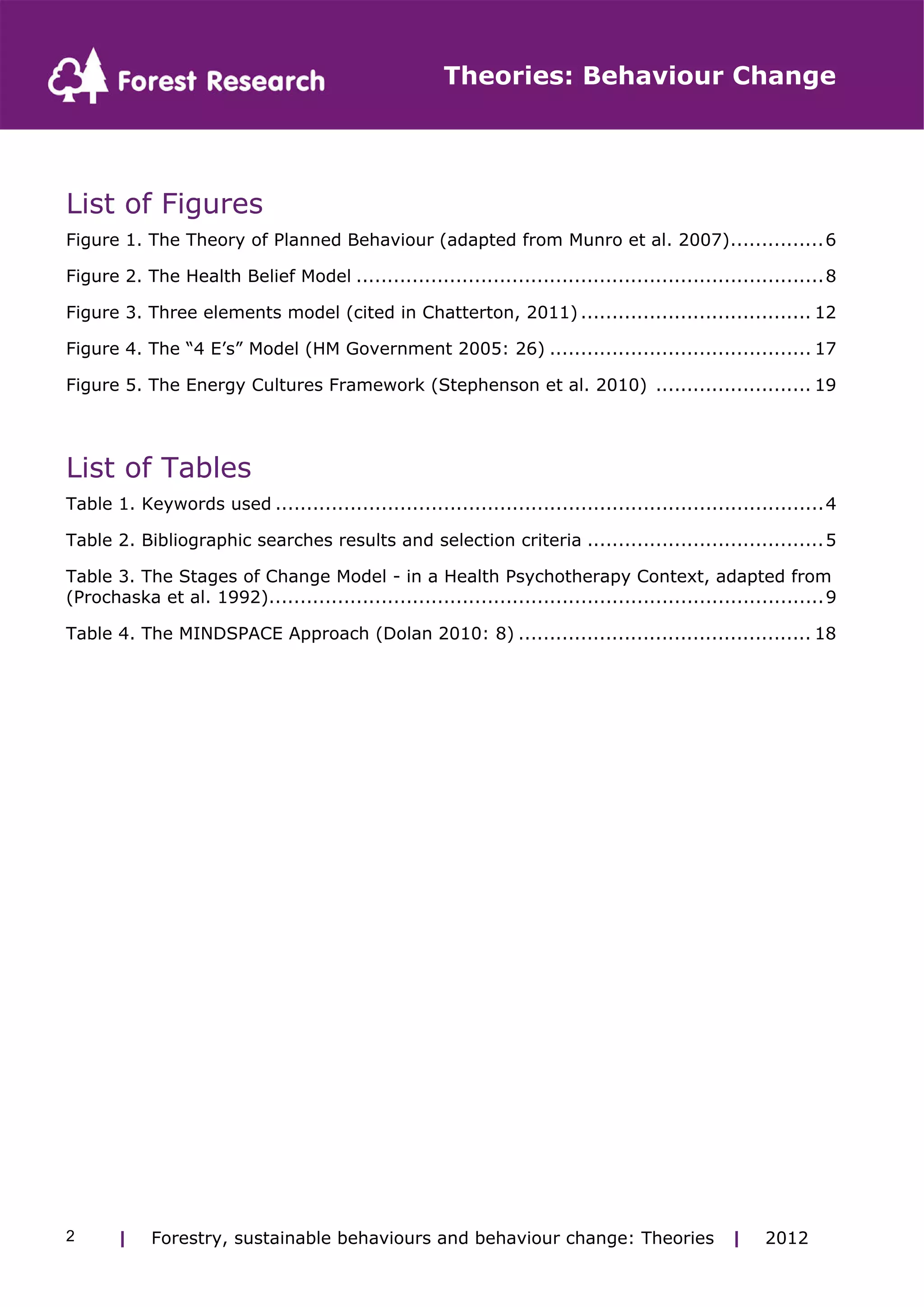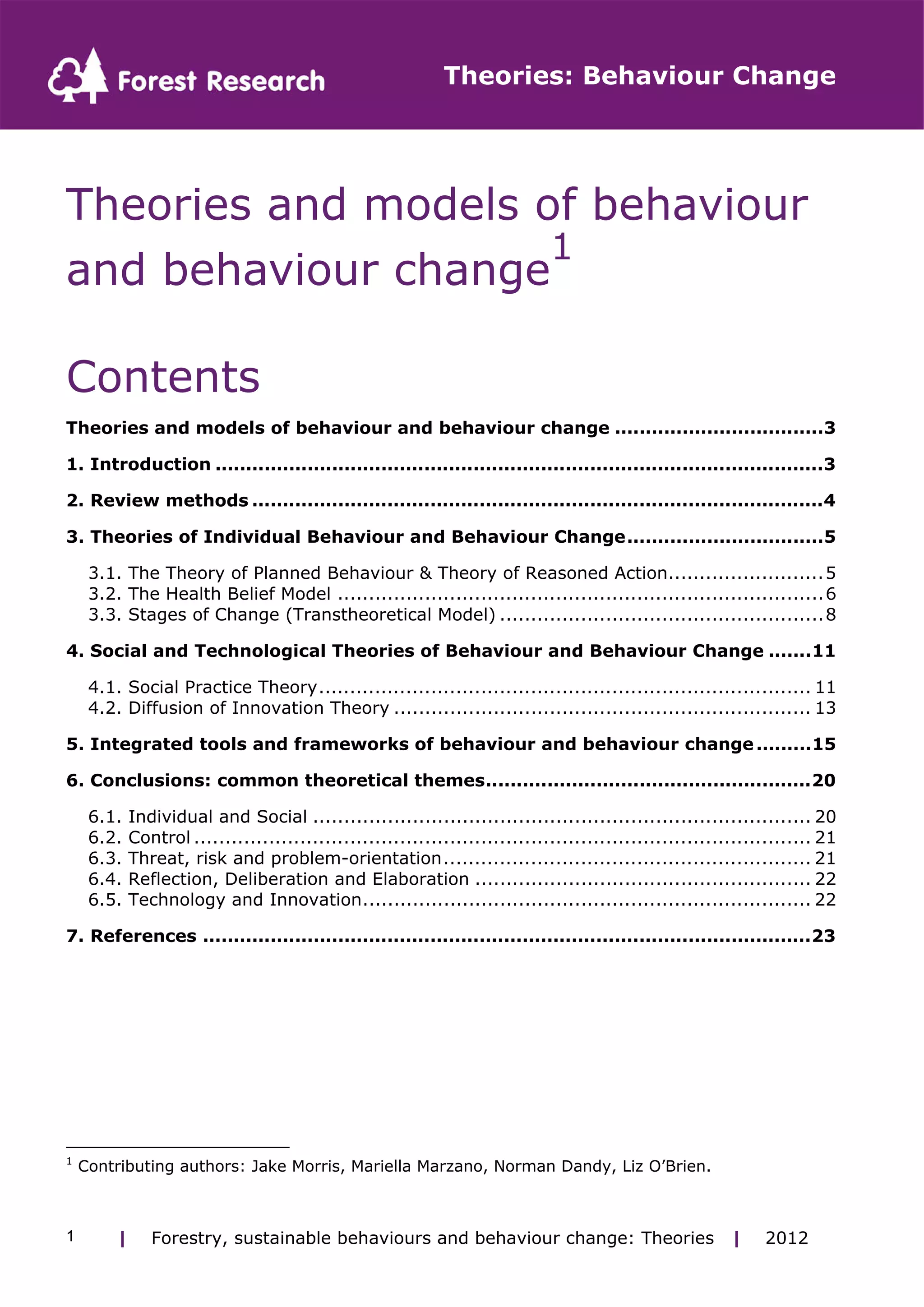 This document reviews several theories and models of individual and social behavior and behavior change. It discusses theories focused on individual cognitive factors like the Theory of Planned Behavior and Health Belief Model. It also examines stage-based models like the Stages of Change Model. Finally, it explores social and technological perspectives like Social Practice Theory and Diffusion of Innovation Theory. The review identifies common themes across theories like consideration of individual and social influences as well as concepts of control, risk, reflection, and technology.
