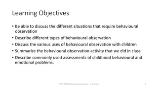 This document discusses various methods of behavioral assessment, including behavioral rating scales, direct observation, and other indirect methods. Behavioral rating scales can measure the frequency and intensity of behaviors through informant reports. Direct observation involves observing and recording behaviors in natural settings. Other methods discussed include continuous performance tests, which measure attention and executive function, and psychophysiological assessments, which record physical changes in the body. The document provides examples of assessment tools for different populations and contexts.