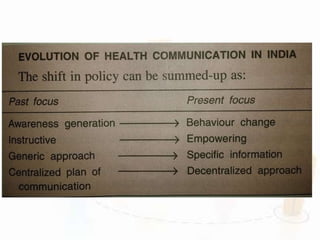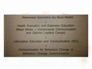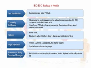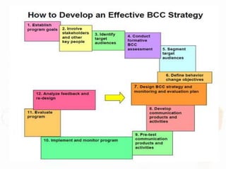 This document discusses behavioral change communication (BCC) and its role in public health programs. It defines BCC as a research-based, client-centered approach aimed at promoting behavior change through benefit-oriented and professionally developed services. BCC principles include community involvement, self-esteem promotion, and voluntary participation. The document outlines BCC's role in HIV/AIDS prevention by increasing knowledge, promoting attitude change, improving skills, and reducing stigma. It also discusses using BCC to achieve reproductive and child health goals by targeting influencers like mothers-in-law. Challenges to effective BCC include integrating it fully into programs and ensuring financial and training resources for sustainability.