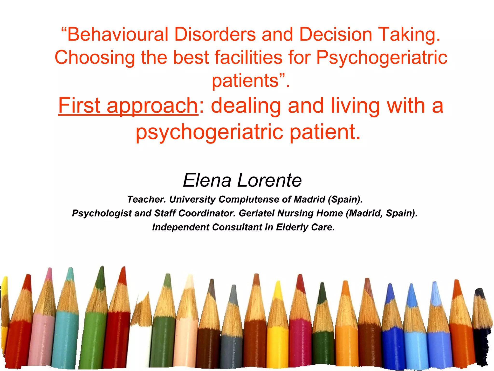 The document discusses the complexities of assessing psychogeriatric patients, highlighting the limitations of numerical data from standardized tests compared to insights from daily life experiences. It emphasizes the role of professionals in understanding patient behavior and the challenges caregivers face, suggesting a need for more comprehensive evaluations that consider behavioral disorders. The author calls for a reassessment of decision-making processes to ensure that suitable resources are assigned based on a holistic view of patient capabilities and conditions.