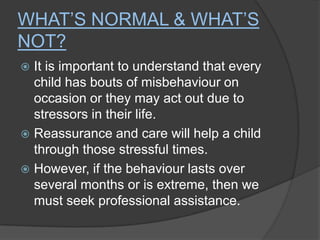 Behavioural disorders in children can take many forms and have various underlying causes. They are generally defined as extreme behaviours that differ significantly from social and cultural norms and negatively impact academic performance or relationships. Common types include conduct disorder, where a child exhibits aggressive or destructive behaviours; oppositional defiant disorder, where a child deliberately seeks to upset others through defiant behaviour; and anxiety/withdrawal, where a child is self-conscious and withdrawn. Treatment may involve cognitive behavioural therapy, medication, and treating any co-occurring conditions. It is important to understand each child's needs and implement structured environments and behaviour plans to help them succeed.