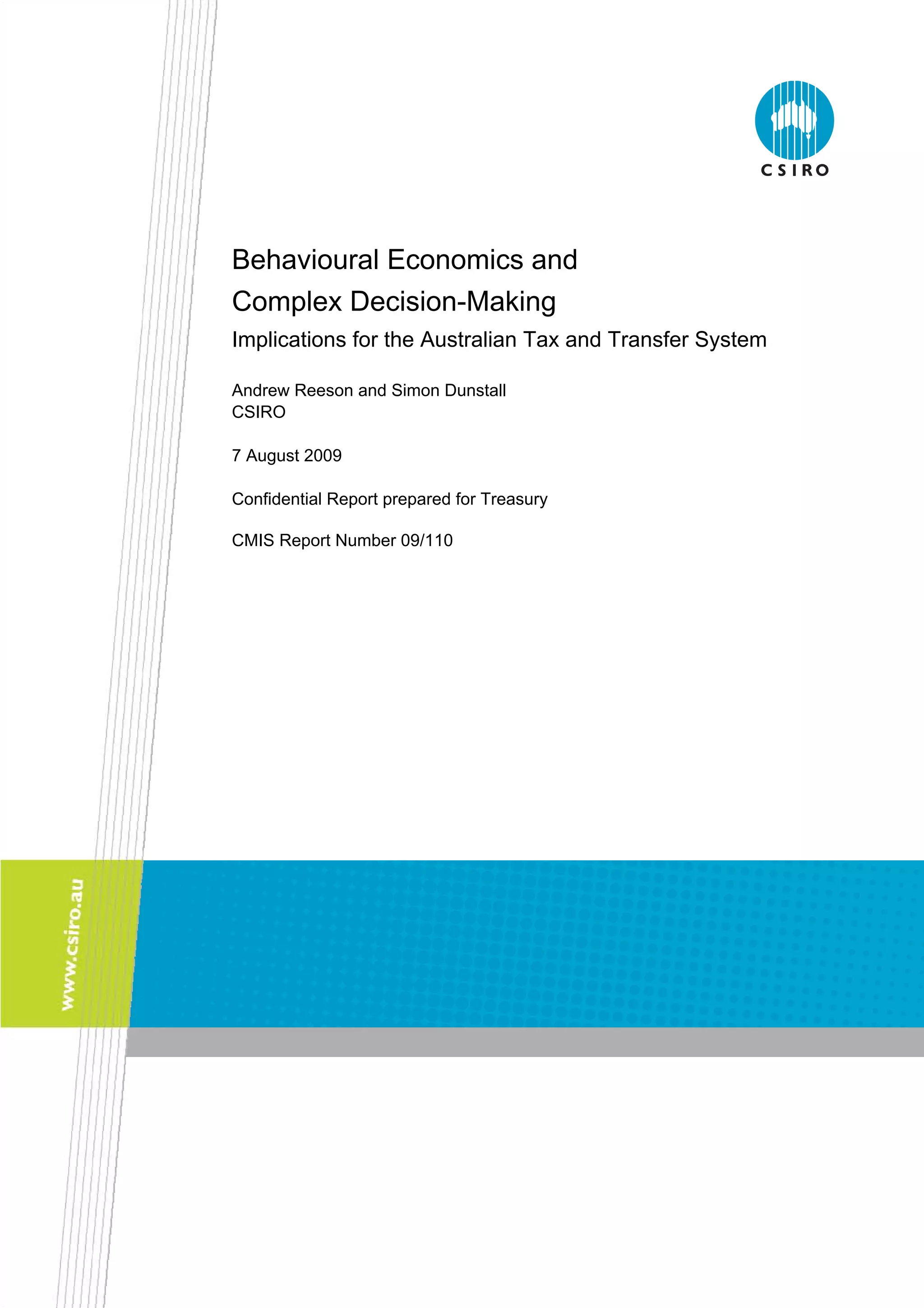 The report examines behavioral economics and its implications for the Australian tax and transfer system, highlighting that human decision-making often deviates from rational economic models due to factors like risk aversion, loss aversion, and a tendency to simplify complex choices. It suggests that simplifying tax processes, such as providing pre-filled tax forms, can help enhance compliance and equity among taxpayers, particularly for those facing financial hardship. The findings are based on a review of academic studies across psychology and economics, emphasizing the need for policies that align with actual human behavior.