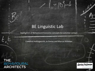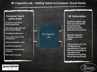 The document discusses the application of behavioral economics in enhancing customer interactions through the BE Linguistic Lab, emphasizing its importance in understanding and influencing consumer behavior. It outlines various cognitive biases and behavioral nudges that can be leveraged to improve customer service metrics such as satisfaction and retention while reducing effort and costs. The document also highlights the collaborative approach of The Behavioral Architects and Davies Hickman to provide actionable insights and solutions for contact centers.